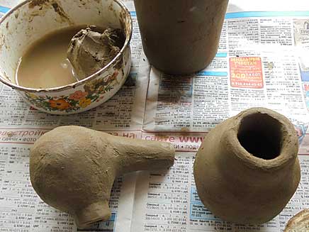 Глина хорошо лепится, но перед тем как начать с ней работать, ее было нужно предварительно подготовить, так как это делают гончары. В ведро с глиной небольшими порциями заливалась вода, глина перемешивалась, а крупные куски разминались руками. Попутно выбрасывался весь попавшийся мусор: камешки, корни и т.п. После того как больших комков не осталось глину уже можно было размешивать в ведре палкой.