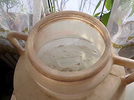 Во льду не смотря на то что старались брать лед, промытый проточной водой осталось довольно много мусора. Он был отфильтрован через вату. На дно бочки засыпан шунгит. До новолуния (10 января) бочка с закрытой крышкой была выставлена на балкон.