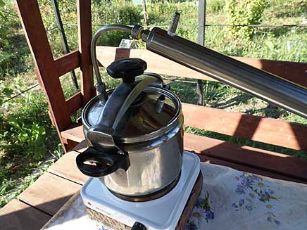 Вся система проверяется на герметичность. Помпа отключается до начала перегонки, а вода остается в холодильнике и шлангах. Нагрев электроплитки включается максимальный.