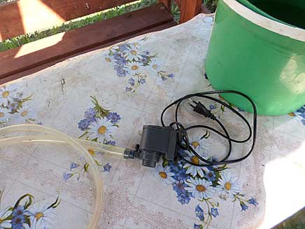 Ведро, в которое погружена помпа, наполняется водой только на треть по следующей причине. Когда вода начнет нагреваться, в нее ставится пластиковая бутылка (бутылки) с замороженной водой и только после этого вода доливается до нужного уровня.