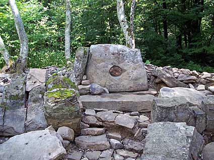 Боковая и передняя стенка первого дольмена с отверстием и выемка (одна из многих) в скале: