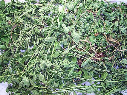 После сушки материал сортируется. Земля и мусор выбрасываются. Для работы отбирается нужное количество лучшего листа. Все остальное откладывается отдельно для извлечения соли. Весь отобранный растительный материал измельчается. Отборный лист на как можно меньшие частицы. Стебли и оставшиеся листья до таких размеров, какие будут удобны при извлечении соли.