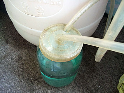Брожение начинается очень быстро и при таких объемах запах будет очень сильным. Что можно сделать в квартире. Летом бочка выносится на балкон. К штуцеру в крышке присоединяется трубка гидрозатвора. Гидрозатвор устроен следующим образом. Стеклянная банка на две трети заполняется водой и закрывается пластиковой крышкой, в которой пробиты два отверстия. Трубка, отводящая углекислый газ погружена в воду. Вторая отводит газ, проходящий через воду в банке за балкон.