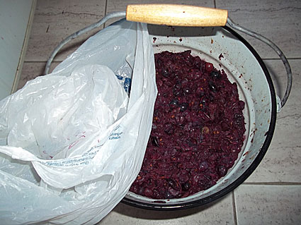 Подходящие емкости для работы - баки из нержавейки (по 40 литров). Эмалированное ведро тоже вполне подходит. Ягоды давятся руками.