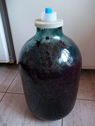 На поверхности образуется «шапка». Виноградный сок сливается через трубку в баллон